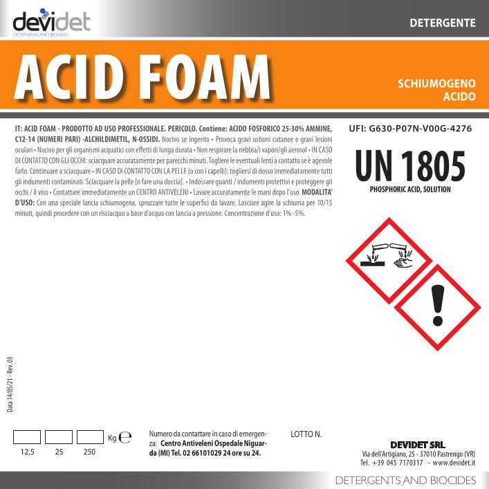 | Altre informazioni | ACID FOAM soddisfa i criteri di classificazione del Regolamento (CE) n. 1272/2008 (CLP). Per informazioni specifiche vedere la scheda di sicurezza. Classe e categoria di pericolo: Corrosione cutanea, 1 Classe e categoria di pericolo: Acute Tox, 4 Classe e categoria di pericolo: Aquatic Chronic, 3 ACID FOAM è definito pericoloso per le varie modalità di trasporto secondo le "Raccomandazioni delle Nazioni Unite sul trasporto di merci pericolose - Norme standard". Per informazioni specifiche, vedere la sezione 14 della scheda di dati di sicurezza. Composizione chimica (Reg. 648/2004/CE): >=5% e <15% tensioattivi anfoteri <5% fosfonati |