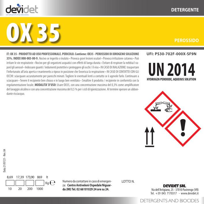 | Altre informazioni | OX35 risponde ai criteri di classificazione del Regolamento (CE) n. 1272/2008 (CLP). Per informazioni specifiche vedasi scheda di dati di sicurezza. Classe, categoria di pericolo: Tossicità acuta, 4 Classe, categoria di pericolo: Gravi lesioni oculari/irritazione oculare, 1 Classe, categoria di pericolo: Corrosione/irritazione della pelle, 2 Classe, categoria di pericolo: Tossicità specifica per gli organi bersaglio (esposizione singola), 3 OX35 è definito pericoloso per le diverse modalità di trasporto secondo le "Raccomandazioni delle Nazioni Unite sul trasporto di merci pericolose - Regolamento tipo". Per informazioni specifiche, vedasi sezione 14 della scheda di dati di sicurezza. Composizione chimica (Reg. 648/2004/CE): >=30% sbiancanti a base di ossigeno |