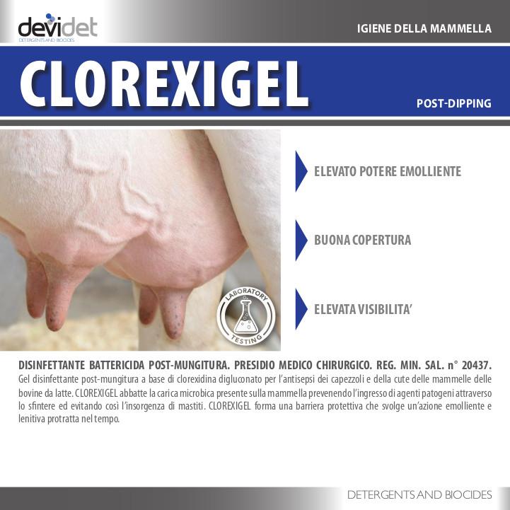 Gel disinfettante post-mungitura a base di clorexidina digluconato (5000 ppm) per la disinfezione dei capezzoli e della cute delle mammelle delle bovine da latte. CLOREXIGEL abbatte la carica microbica presente sulla mammella, prevenendo l’ingresso di agenti patogeni attraverso lo sfintere, evitando così l’insorgenza di mastiti. CLOREXIGEL forma una barriera protettiva che svolge un’azione emolliente e lenitiva protratta nel tempo.