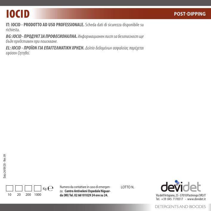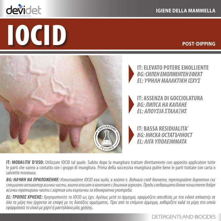 Gel indicato per il post-mungitura con povidone iodio (1150 ppm). Grazie alla sua formulazione, IOCID contribuisce a proteggere le mammelle e svolge un’azione emolliente e lenitiva conservando le naturali caratteristiche della cute. IOCID ha una colorazione stabile che consente sempre una chiara identificazione delle parti trattate.