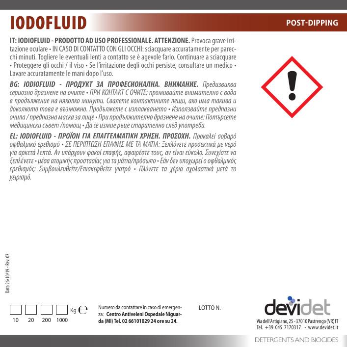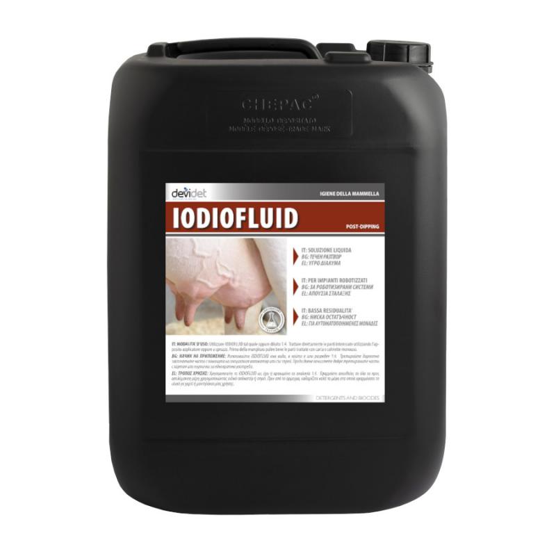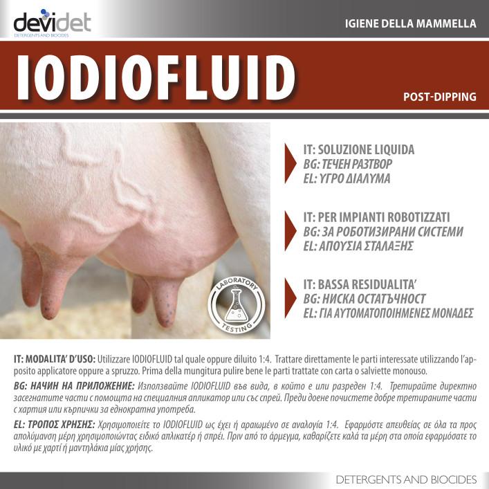 Liquido post-mungitura con povidone iodio (5750 ppm). Gli emollienti ed i lenitivi di IODIOFLUID contribuiscono a proteggere le mammelle conservando il naturale livello di idratazione della cute. IODIOFLUID ha una colorazione stabile che consente sempre una chiara identificazione delle parti trattate.