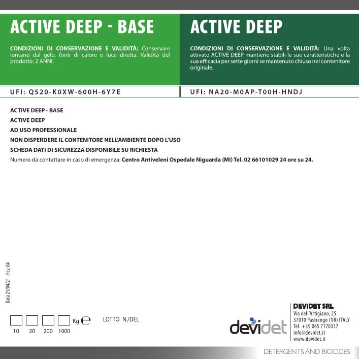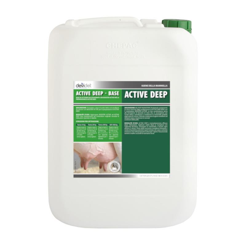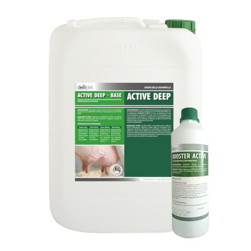 Gel post-mungitura, ottenuto dalla combinazione di ACTIVE DEEP - Base con il catalizzatore BOOSTER ACTIVE. La loro combinazione porta alla formazione di biossido di cloro che, in associazione con l’acido lattico, contribuisce a mantenere le mammelle protette dagli attacchi esterni. L’elevato contenuto di agenti emollienti ed idratanti aiuta a mantenere le normali condizioni della pelle. La speciale combinazione bi-attiva di ACTIVE DEEP (biossido di cloro – acido organico) assicura un’intensa azione istantanea accompagnata da un’azione protettiva prolungata nel tempo. ACTIVE DEEP ha una colorazione caratteristica stabile nel tempo che garantisce sempre la chiara identificazione delle parti trattate.