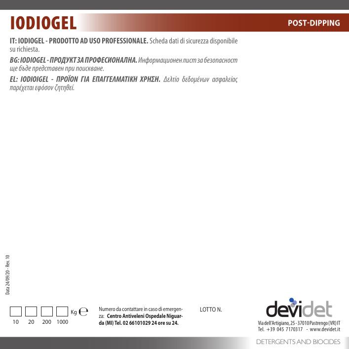 Iodiogel post dipping con povidone iodio è disponibile nei seguenti formati: Tanica da 10 - 20 kg; Fusto da 200 kg; IBC da 1.000 kg.