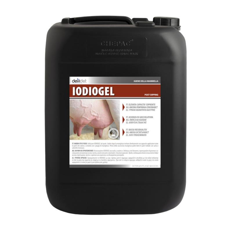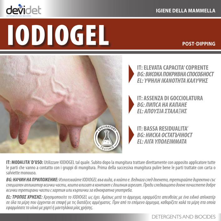 Gel ad alto potere emolliente indicato il trattamento post-mungitura con povidone iodio (1150 ppm). La presenza di emollienti ed ammorbidenti conferiscono al prodotto potere idratante ed emollienza. Grazie alla sua formulazione, IODIOGEL contribuisce a proteggere le mammelle e svolge un’azione emolliente e lenitiva conservando le naturali caratteristiche della cute. IODIOGEL ha una colorazione stabile che consente sempre una chiara identificazione delle parti trattate.