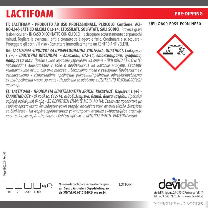 | Altre informazioni | LACTIFOAM risponde ai criteri di classificazione del Regolamento (CE) n. 1272/2008 (CLP). Per informazioni specifiche vedasi scheda di dati di sicurezza. Classe, categoria di pericolo: Gravi lesioni oculari/irritazione oculare, 1 LACTIFOAM non è definito pericoloso per le diverse modalità di trasporto secondo le "Raccomandazioni delle Nazioni Unite sul trasporto di merci pericolose - Regolamento tipo". Composizione chimica (Reg. 648/2004/CE): <5% tensioattivi non ionici |