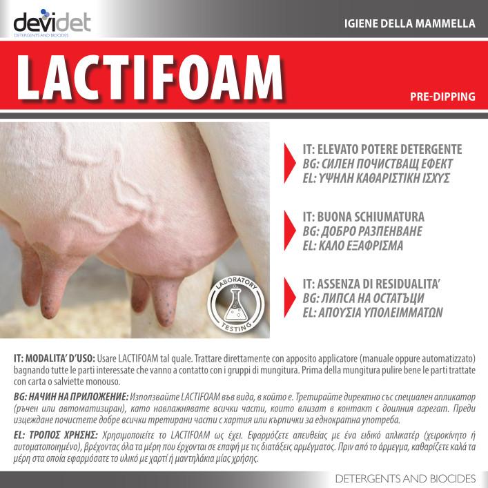 Detergente schiumogeno pronto all’uso appositamente formulato per detergere delicatamente la cute sia prima che dopo le operazioni di mungitura. I suoi ingredienti emollienti e lenitivi, inclusa lanolina,e l’azione tempone dell’acido lattico conservano le naturali caratteristiche della cute. LACTIFOAM forma una schiuma stabile e leggera che ricopre completamente le parti trattate con un consumo ridotto di prodotto garantendo al contempo un elevato tempo di contatto per un’azione detergente completa. LACTIFOAM è particolarmente indicato per i periodi più freddi dell’anno prevenendo la formazione di screpolature e ragadi.