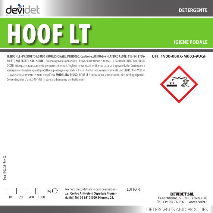 | Altre informazioni | HOOF LT risponde ai criteri di classificazione del Regolamento (CE) n. 1272/2008 (CLP). Per informazioni specifiche vedasi scheda di dati di sicurezza. Classe, categoria di pericolo: Gravi lesioni oculari/irritazione oculare, 1 Classe, categoria di pericolo: Corrosione/irritazione della pelle, 2 HOOF LT non è definito pericoloso per le diverse modalità di trasporto secondo le "Raccomandazioni delle Nazioni Unite sul trasporto di merci pericolose - Regolamento tipo". Composizione chimica (Reg. 648/2004/CE): <5% tensioattivi anionici. |
