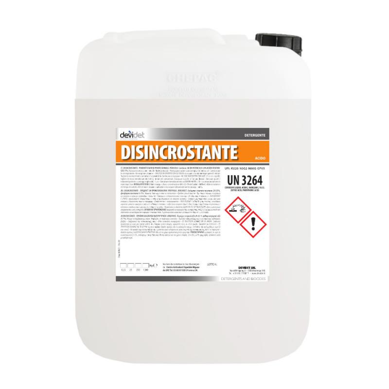 DISINCROSTANTE è un formulato a base di acidi minerali, molto efficace nella solubilizzazione e rimozione dei precipitati sia di natura organica che inorganica (es. pietra del latte).DISINCROSTANTE trova applicazione per la pulizia di impianti di mungitura, cip di lavaggio, vasche di stoccaggio e refrigerazione del latte. La sua speciale formula è particolarmente indicata per la pulizia delle superfici in acciaio inox, vetro, piastrellato e le principali superfici tipiche del settore lattiero-caseari.