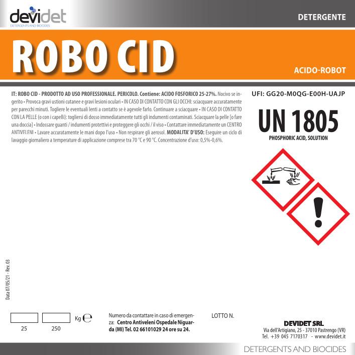 Altre informazioniROBO CID risponde ai criteri di classificazione del Regolamento (CE) n. 1272/2008 (CLP). Per informazioni specifiche vedasi scheda di dati di sicurezza.